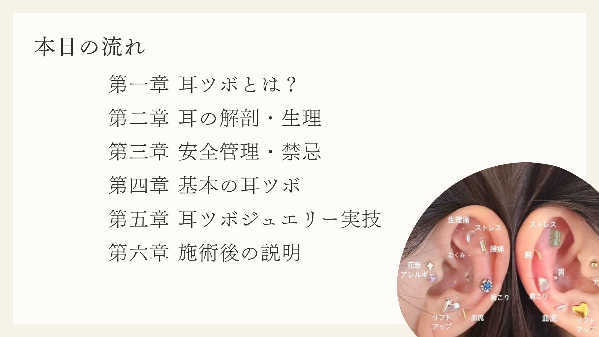 - 第一章:耳つぼとは?耳つぼの歴史や効果、現代における活用方法を学びます。
