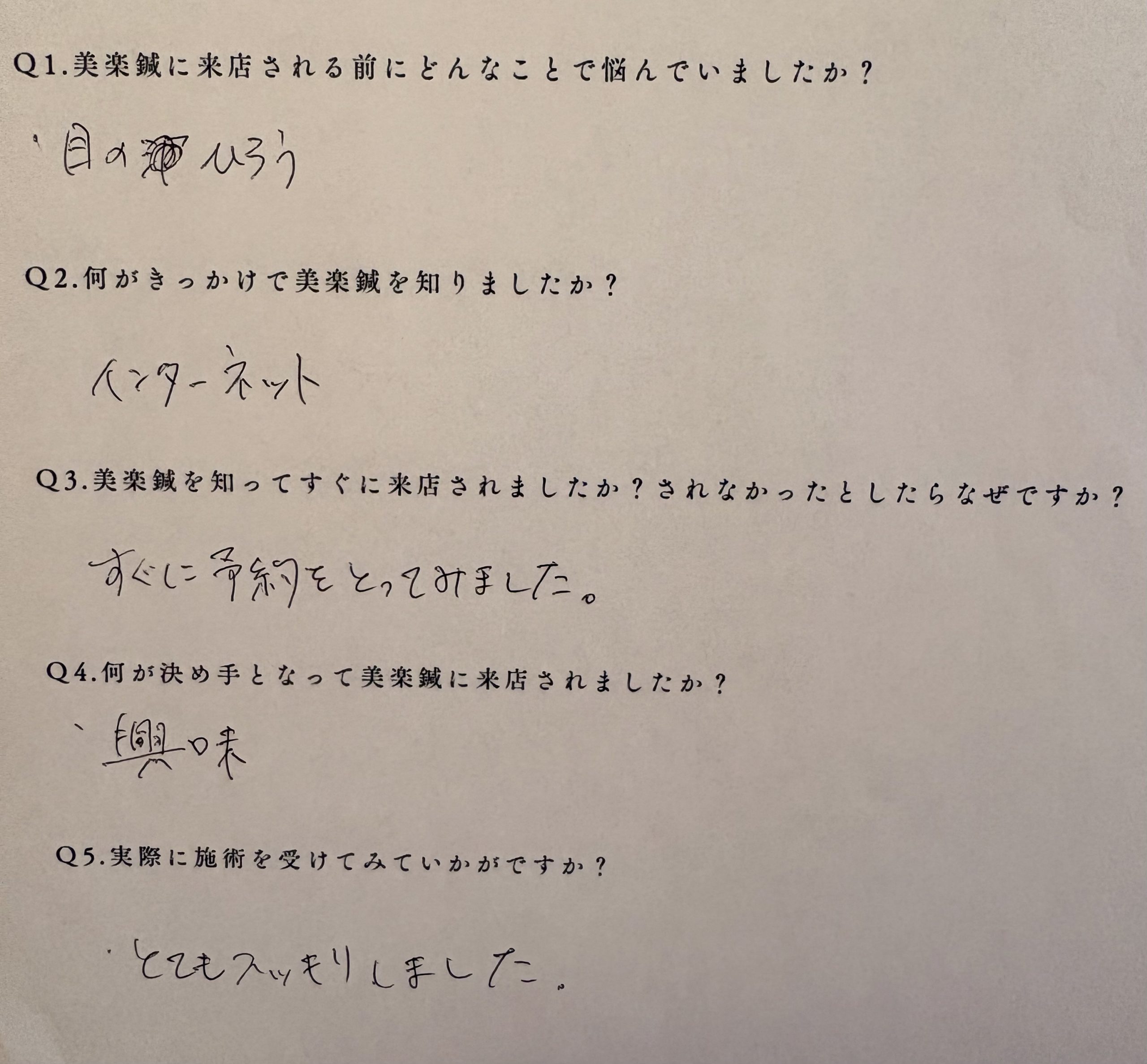 目の疲労というお悩みをきっかけに、インターネットで美楽鍼を見つけてくださり、興味を持ってすぐにご予約いただけたことを大変嬉しく思います。