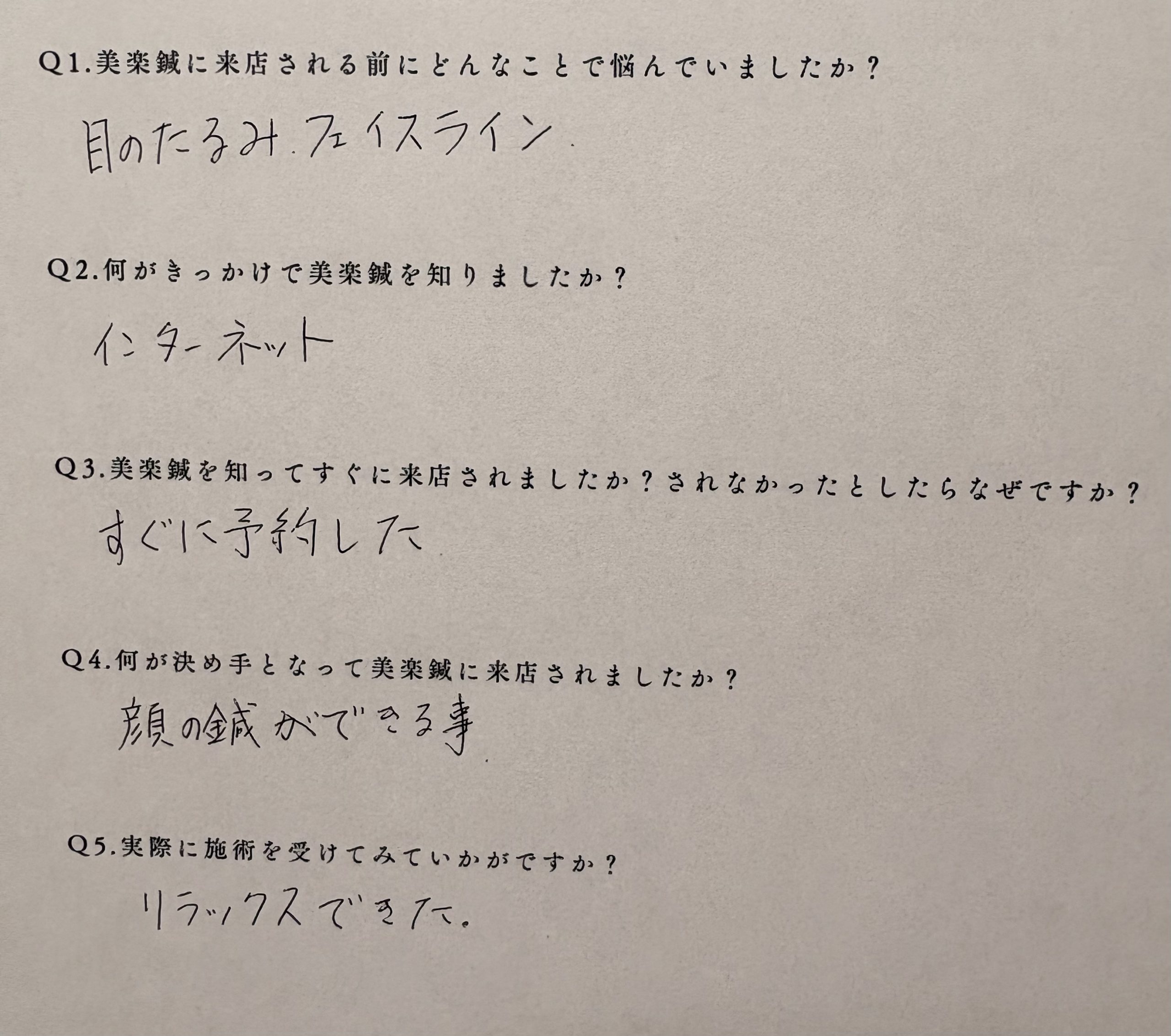 目のたるみやフェイスラインのお悩みをきっかけに、インターネットで美楽鍼を見つけてくださり、すぐにご予約いただけたことを大変嬉しく思います。